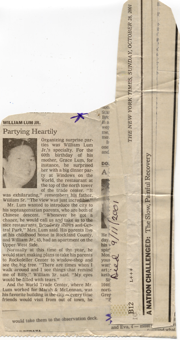 Profile of William Lum Jr., New York Times, October 28, 2001. Three days after the September 11 attacks, reporters at The New York Times, armed with stacks of the homemade missing-persons fliers that were papering the city, began dialing the numbers on the fliers, interviewing friends and relatives of the missing and writing brief portraits, or sketches, of their lives. December 31, 2001 brought the final daily edition of Portraits of Grief, but additional profiles were published from time to time. All of the profiles remain on NYTimes.com indefinitely.