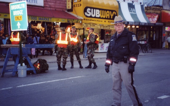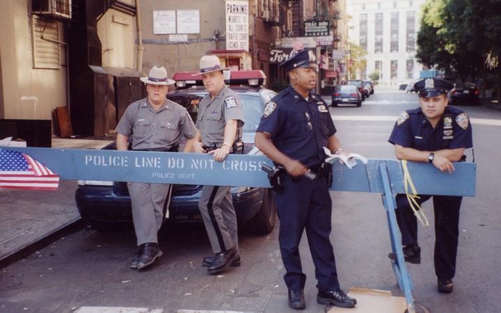 Police barricades on Baxter Street mark off the "frozen zone" after 9-11.